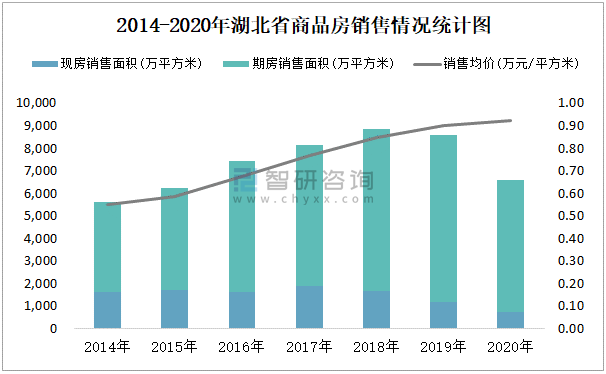 根據國家統計局數據統計可知:2021年7月湖北省商品房銷售面積為569.74萬平方米(其中銷售現房45.7萬平方米,期房524.04萬平方米),銷售額為527.73億元,銷售均價約為0.93萬元/平方米;2021年1-7月湖北省商品房累計銷售面積為3963.08萬平方米,銷售面積累計同比增長64.4%,累計銷售額為3837.3億元,銷售額累計同比增長80.5%;2014-2020年湖北省商品房總銷售面積2018年達到最高值,此后有所下滑,其中期房銷售面積大大高于現房銷售面積,銷售均價逐年遞增。