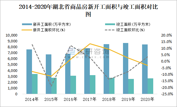 2014-2020年湖北省商品房新開工面積與竣工面積對比圖