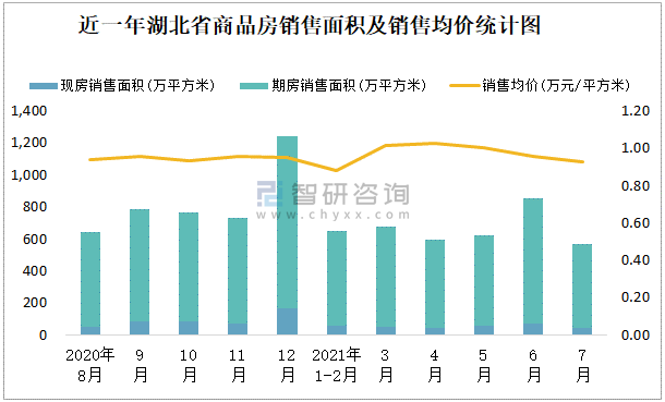 近一年湖北省商品房銷售面積及銷售均價統計圖