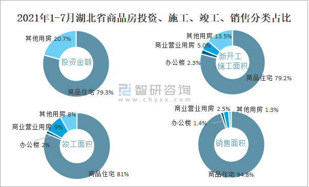2021年1-7月湖北省商品房投資、施工、竣工、銷售分類占比