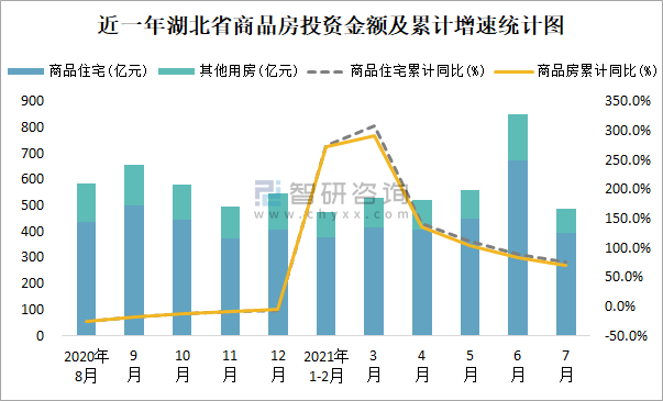 根據國家統計局數據統計可知:2021年7月湖北省房地產開發投資商品房投資金額為488.35億元(其中商品住宅為395.64億元,辦公樓、商業營業用房等其他用房92.71億元);2021年1-7月湖北省房地產開發投資商品房累計投資金額為3431.02億元,投資金額累計同比增長70%。