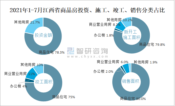 2021年1-7月江西省商品房投資、施工、竣工、銷售分類占比