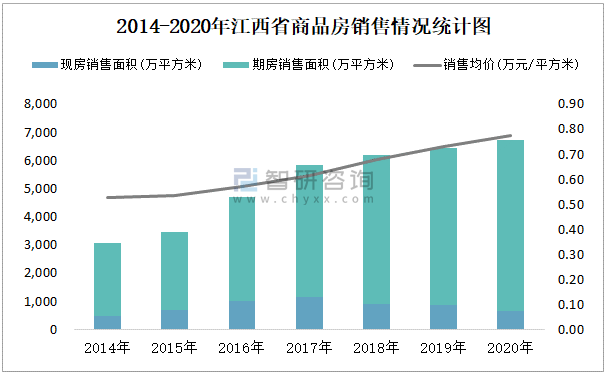 根據國家統計局數據統計可知:2021年7月江西省商品房銷售面積為531.65萬平方米(其中銷售現房59.45萬平方米,期房472.2萬平方米),銷售額為418.17億元,銷售均價約為0.79萬元/平方米;2021年1-7月江西省商品房累計銷售面積為4148.25萬平方米,銷售面積累計同比增長28.3%,累計銷售額為3187.05億元,銷售額累計同比增長28.7%;2014-2020年江西省商品房總銷售面積逐年遞增,其中期房銷售面積大大高于現房銷售面積,銷售均價逐年遞增。