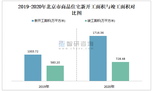 2019-2020年北京市商品住宅新開工面積與竣工面積對比圖