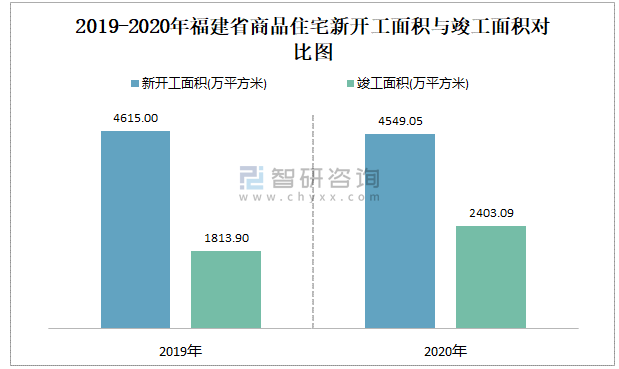 2019-2020年福建省商品住宅新開工面積與竣工面積對比圖