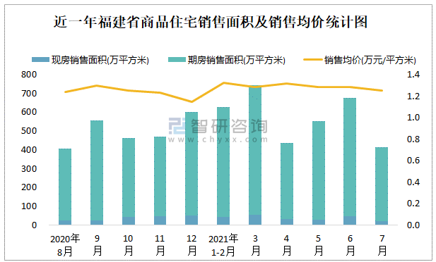 根據國家統計局數據可知:2021年7月福建省商品住宅銷售面積為414.84萬平方米(其中銷售現房19.52萬平方米,期房395.32萬平方米),銷售額為519.94億元,銷售均價約為1.25萬元/平方米;2021年1-7月福建省商品住宅累計銷售面積為3446萬平方米,銷售面積累計同比增長26.9%,累計銷售額為4453.01億元,銷售額累計同比增長36.1%;近一年福建省商品住宅銷售均價2021年1-2月達到最高值,此后有所下滑,期房銷售面積遠高于現房銷售面積。