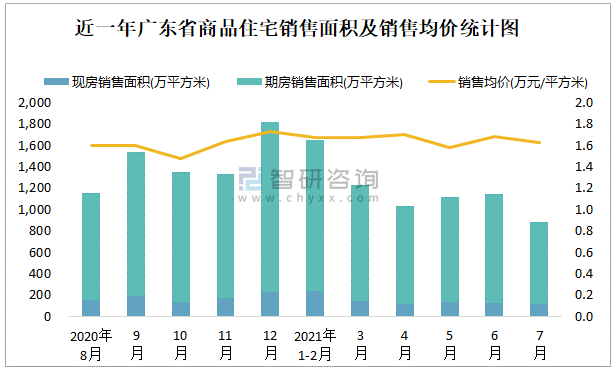 近一年廣東省商品住宅銷售面積及銷售均價統(tǒng)計圖