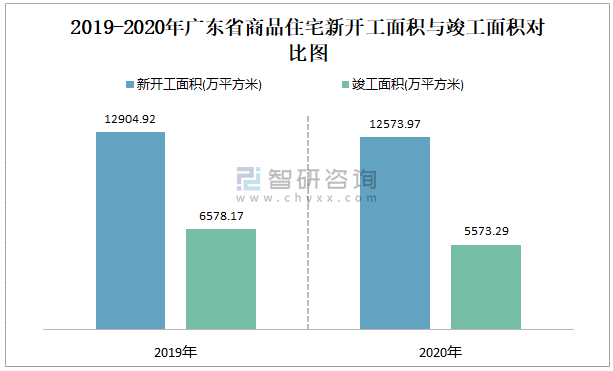 2019-2020年廣東省商品住宅新開工面積與竣工面積對比圖