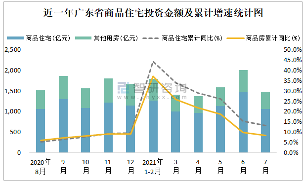 近一年廣東省商品住宅投資金額及累計增速統(tǒng)計圖
