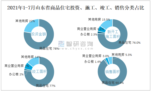 2021年1-7月山東省商品住宅投資、施工、竣工、銷售分類占比
