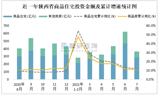 根據國家統計局數據統計可知:2021年7月陜西省房地產開發投資商品房投資金額為364.2億元(其中商品住宅為287.56億元,辦公樓、商業營業用房等其他用房76.64億元);2021年1-7月陜西省房地產開發投資商品住宅累計投資金額為1805.28億元,投資金額累計同比增長12.2%。