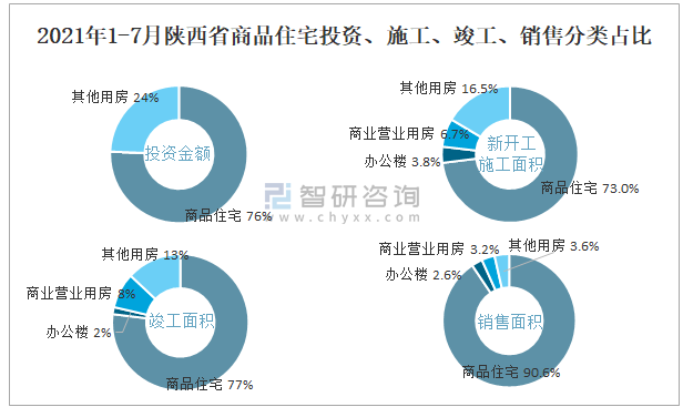 2021年1-7月陜西省商品住宅投資、施工、竣工、銷售分類占比