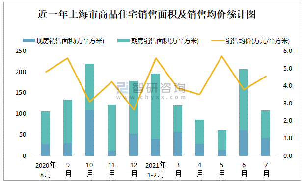 根據國家統計局數據可知:2021年7月上海市商品住宅銷售面積為107.71萬平方米(其中銷售現房43萬平方米,期房64.71萬平方米),銷售額為490.65億元,銷售均價約為4.56萬元/平方米;2021年1-7月上海市商品住宅累計銷售面積為775.65萬平方米,銷售面積累計同比增長14.8%,累計銷售額為3475.09億元,銷售額累計同比增長47.3%;近一年上海市商品住宅銷售均價2021年5月達到最高值,此后有所下滑,期房銷售面積遠高于現房銷售面積。