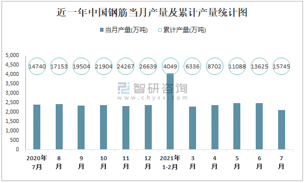 近一年中國(guó)鋼筋當(dāng)月產(chǎn)量及累計(jì)產(chǎn)量統(tǒng)計(jì)圖