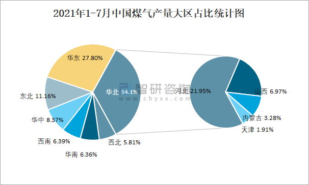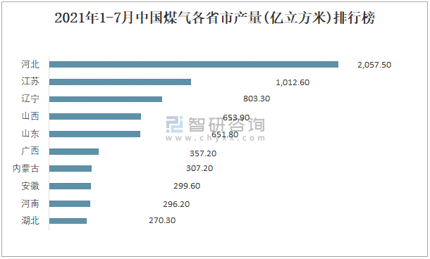 根據國家統計局數據顯示:2021年各季度(第三季度暫只統計7月數據)中國煤氣主要集中在華北、華東、東北地區生產;2021年1-7月中國煤氣產量大區分布不均衡,其中華北地區產量最高,特別是河北省貢獻了最多產量;2021年1-7月中國煤氣各省市產量top1遙遙領先于其他前9名。