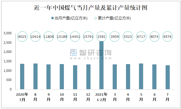 根據國家統計局數據顯示:2021年7月中國煤氣產量為1300億立方米,同比下降6.6%;2021年1-7月中國煤氣累計產量為9375.5億立方米,累計增長2.9%;2015-2020年中國煤氣產量逐年遞增,2020年達到最大。