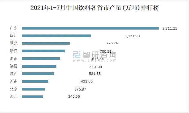 2021年1-7月中國(guó)飲料各省市產(chǎn)量排行榜