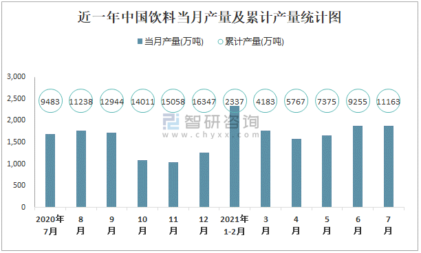 根據(jù)國(guó)家統(tǒng)計(jì)局?jǐn)?shù)據(jù)顯示:2021年7月中國(guó)飲料產(chǎn)量為1887萬(wàn)噸,同比增長(zhǎng)10.1%;2021年1-7月中國(guó)飲料累計(jì)產(chǎn)量為11162.8萬(wàn)噸,累計(jì)增長(zhǎng)15.4%;2015-2020年中國(guó)飲料產(chǎn)量2018年跌至最低,此后總體呈現(xiàn)上升趨勢(shì)。