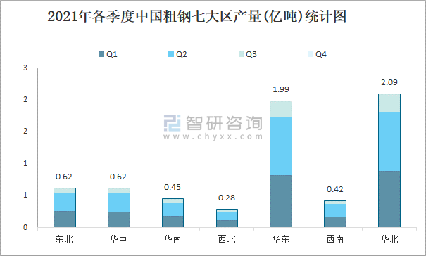 2021年各季度中國(guó)粗鋼七大區(qū)產(chǎn)量統(tǒng)計(jì)圖