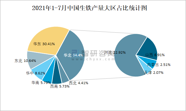 根據國家統計局數據顯示:2021年各季度(第三季度暫只統計7月數據)中國生鐵主要集中在華北、華東、東北地區生產;2021年1-7月中國生鐵產量大區分布不均衡,其中華北地區產量最高,特別是河北省貢獻了最多產量;2021年1-7月中國生鐵各省市產量top1遙遙領先于其他前9名。