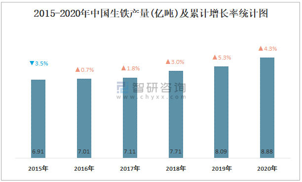 根據國家統計局數據顯示:2021年7月中國生鐵產量為0.7億噸,同比下降8.9%;2021年1-7月中國生鐵累計產量為5.3億噸,累計增長2.3%;2015-2020年中國生鐵產量逐年遞增,2020年達到最高。