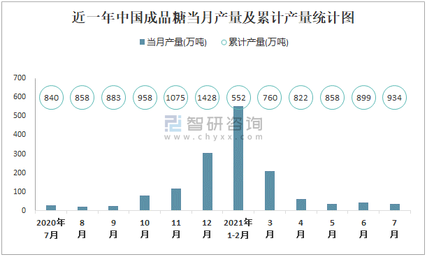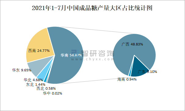 2021年1-7月中國成品糖產量為933.5萬噸 華南地區產量最高(占比58.9%)