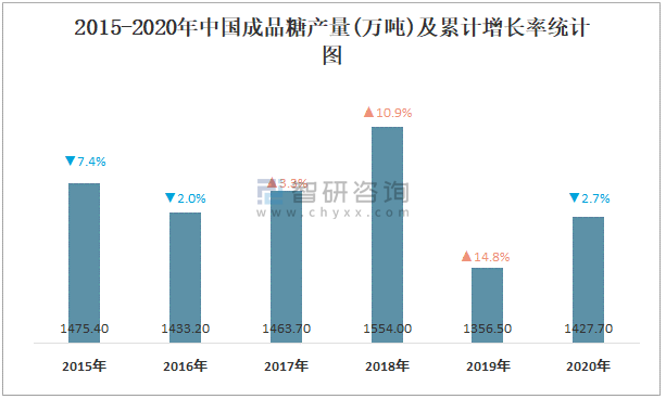 2015-2020年中國成品糖產量及增長情況統計圖