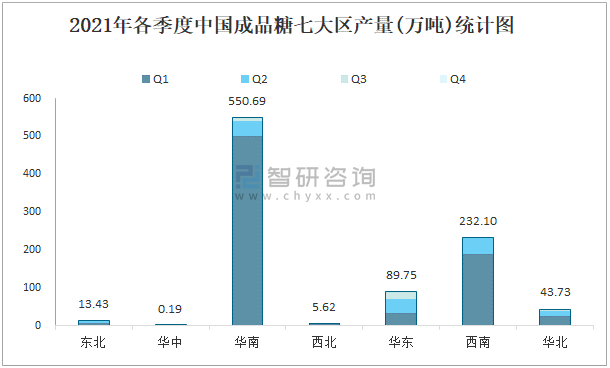 2021年各季度中國成品糖七大區產量統計圖