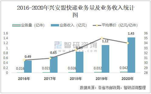 2016-2020年興安盟快遞業(yè)務量及業(yè)務收入統(tǒng)計圖