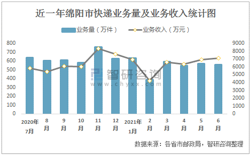 近一年綿陽市快遞業務量及業務收入統計圖