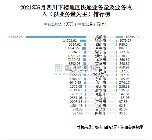 2021年6月四川下轄地區(qū)快遞業(yè)務(wù)量及業(yè)務(wù)收入(以業(yè)務(wù)量為主)排行榜