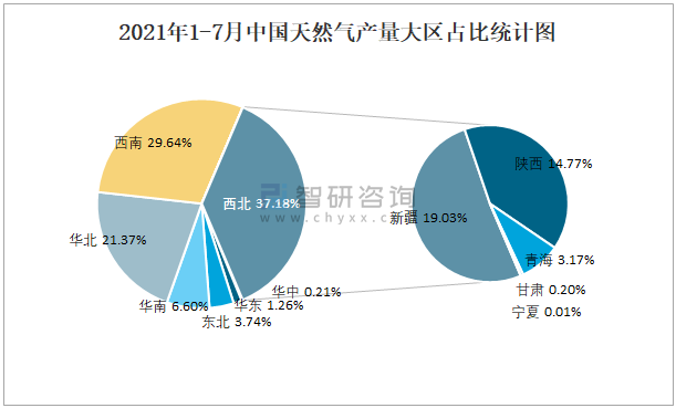 2021年1-7月中國天然氣產量大區占比統計圖