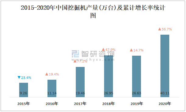 2015-2020年中國挖掘機產量及增長率統計圖