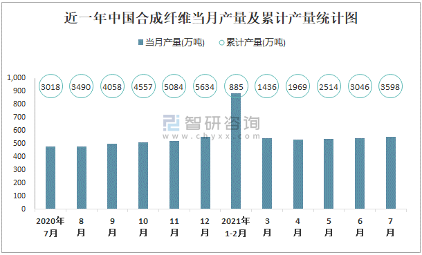 根據(jù)國家統(tǒng)計局數(shù)據(jù)顯示:2021年7月中國合成纖維產(chǎn)量為552萬噸,同比增長9.9%;2021年1-7月中國合成纖維累計產(chǎn)量為3598萬噸,累計增長16.2%;2015-2020年中國合成纖維產(chǎn)量2017年跌至最低,此后逐年遞增。