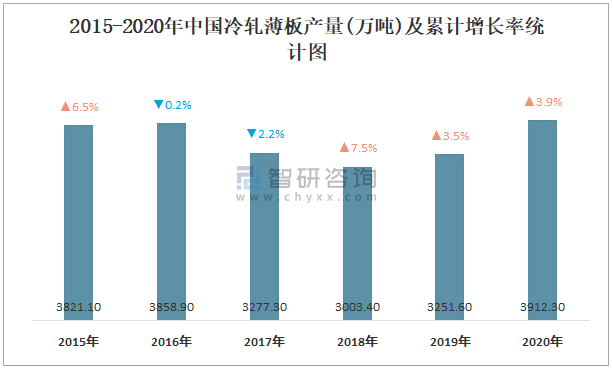 2015-2020年中國冷軋薄板產量及增長率統計圖