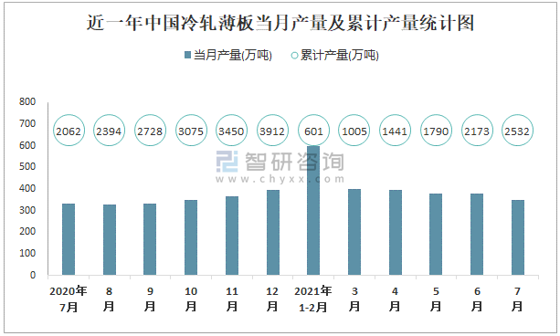 近一年中國冷軋薄板當月產量及累計產量統計圖