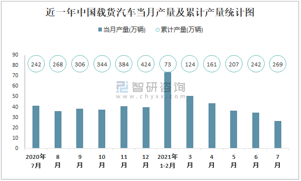 根據國家統計局數據顯示:2021年7月中國載貨汽車產量為26.6萬輛,同比下降38.1%;2021年1-7月中國載貨汽車累計產量為268.6萬輛,累計增長6.6%;2015-2020年中國載貨汽車產量逐年遞增,2020年達到最高。
