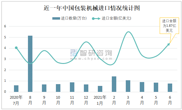 根據中國海關數據顯示:2021年6月中國包裝機械進口數量為0.76萬臺,同比增長136.1%,進口金額為1.87億美元,同比增長34.9%,2021年6月中國包裝機械出口數量為177.42萬臺,同比增長50.7%,出口金額為3.2億美元,同比增長18.4%;2021年1-6月中國包裝機械進口數量為5.12萬臺,進口金額為9.31億美元,出口數量為903.63萬臺,出口金額為16.88億美元。