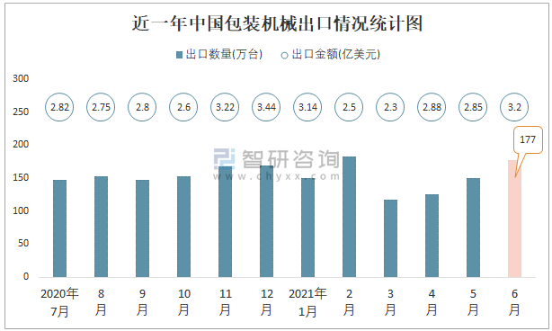 2021年6月中國包裝機械進出口數量分別為0.76萬臺和177.42萬臺