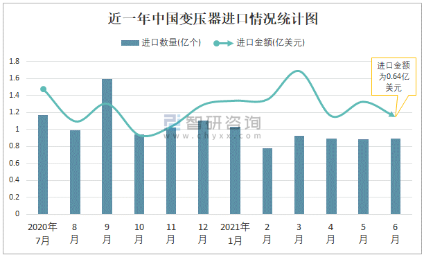 根據中國海關數據顯示:2021年6月中國變壓器進口數量為0.89億個,同比下降9.3%,進口金額為0.64億美元,同比增長6.4%,2021年6月中國變壓器出口數量為2.62億個,同比增長23.8%,出口金額為3.39億美元,同比增長48.3%;2021年1-6月中國變壓器進口數量為5.39億個,進口金額為4.45億美元,出口數量為15.9億個,出口金額為16.56億美元。