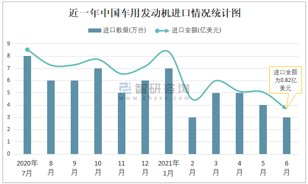 根據中國海關數據顯示:2021年6月中國車用發動機進口數量為3萬臺,同比下降57.3%,進口金額為0.82億美元,同比下降47.2%,2021年6月中國車用發動機出口數量為31萬臺,同比增長26.8%,出口金額為1.74億美元,同比增長78.5%;2021年1-6月中國車用發動機進口數量為27萬臺,進口金額為7.28億美元,出口數量為191萬臺,出口金額為11.86億美元。