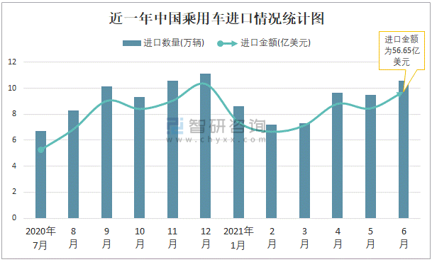 根據(jù)中國海關(guān)數(shù)據(jù)顯示:2021年6月中國乘用車進口數(shù)量為10.58萬輛,同比增長29.8%,進口金額為56.65億美元,同比增長52.1%,2021年6月中國乘用車出口數(shù)量為14.12萬輛,同比增長219.7%,出口金額為19.12億美元,同比增長200%;2021年1-6月中國乘用車進口數(shù)量為52.83萬輛,進口金額為280.92億美元,出口數(shù)量為70.88萬輛,出口金額為91.98億美元。