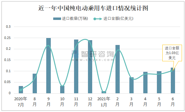 根據(jù)中國海關數(shù)據(jù)顯示:2021年6月中國純電動乘用車進口數(shù)量為0.12萬輛,同比增長15.5%,進口金額為1.03億美元,同比增長67%,2021年6月中國純電動乘用車出口數(shù)量為2.02萬輛,同比增長156.7%,出口金額為3.84億美元,同比增長159%;2021年1-6月中國純電動乘用車進口數(shù)量為0.61萬輛,進口金額為5.48億美元,出口數(shù)量為15.3萬輛,出口金額為25.86億美元。