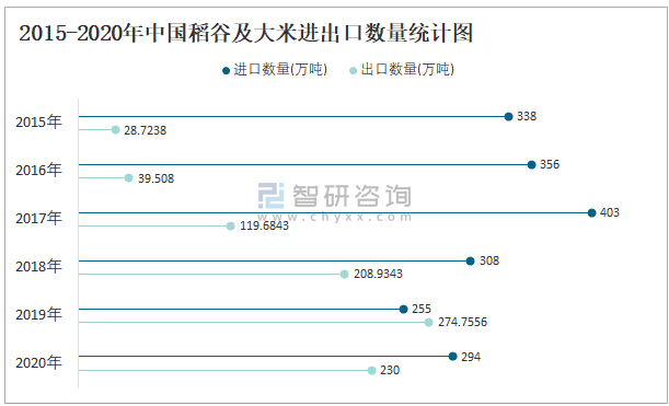 2015-2020年中國(guó)稻谷及大米進(jìn)出口數(shù)量統(tǒng)計(jì)圖