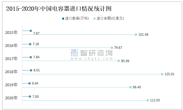 2015-2020年中國電容器進(jìn)口情況統(tǒng)計圖
