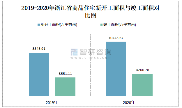 2019-2020年浙江省商品住宅新開工面積與竣工面積對比圖