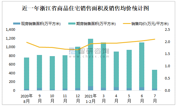根據國家統計局數據可知:2021年7月浙江省商品住宅銷售面積為476.27萬平方米(其中銷售現房44.24萬平方米,期房432.03萬平方米),銷售額為1003.83億元,銷售均價約為2.11萬元/平方米;2021年1-7月浙江省商品住宅累計銷售面積為5700.94萬平方米,銷售面積累計同比增長22.7%,累計銷售額為11268.6億元,銷售額累計同比增長37.9%;近一年浙江省商品住宅銷售均價2020年12月跌至最低值,此后總體呈現上升趨勢,期房銷售面積遠高于現房銷售面積。