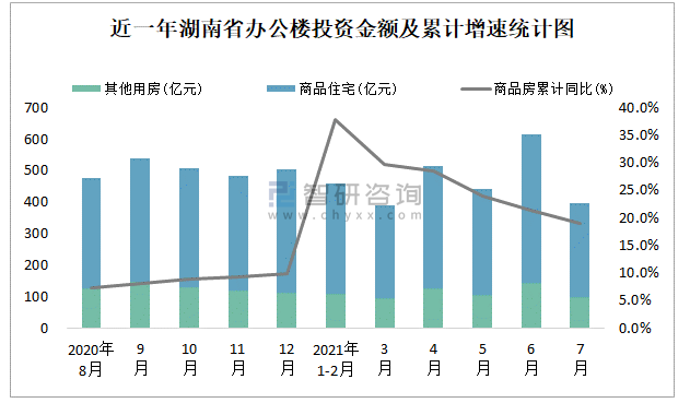 根據國家統計局數據統計可知:2021年7月湖南省房地產開發投資商品房投資金額為397.95億元,其中包括辦公樓、商業營業用房等其他用房97.23億元(注:辦公樓、商業營業用房未分開統計);2021年1-7月湖南省房地產開發投資包括辦公樓在內的其他用房累計金額為679.57億元。
