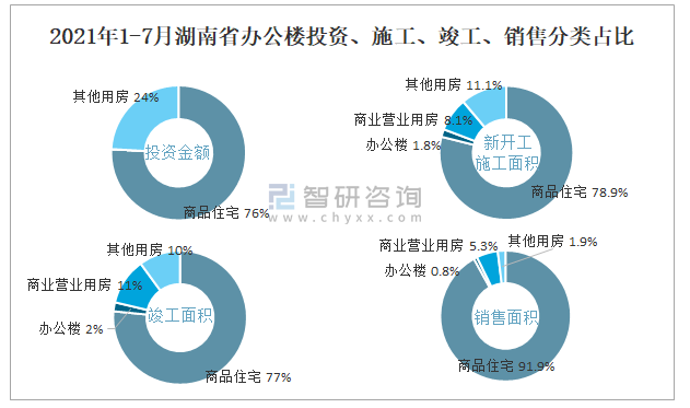 根據國家統計局數據統計可知:2021年1-7月湖南省房地產開發企業在包括辦公樓在內的其他用房投資金額占比為24.1%(注:只有投資金額中其他用房包含辦公樓、商業營業用房),辦公樓的新開工面積與竣工面積所占比重差異不大,從銷售面積來看,辦公樓銷售面積占比少于商業營業用房銷售面積占比。