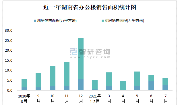 根據國家統計局數據可知:2021年7月湖南省辦公樓銷售面積為6.1萬平方米(其中銷售現房2.79萬平方米,期房3.31萬平方米);2021年1-7月湖南省辦公樓累計銷售面積為41.93萬平方米;近一年湖南省辦公樓期房銷售面積遠高于現房銷售面積,2021年7月四川、廣東、江蘇的辦公樓銷售面積最多,江蘇、上海、浙江、廣東的辦公樓現房銷售面積高于其他各省市。